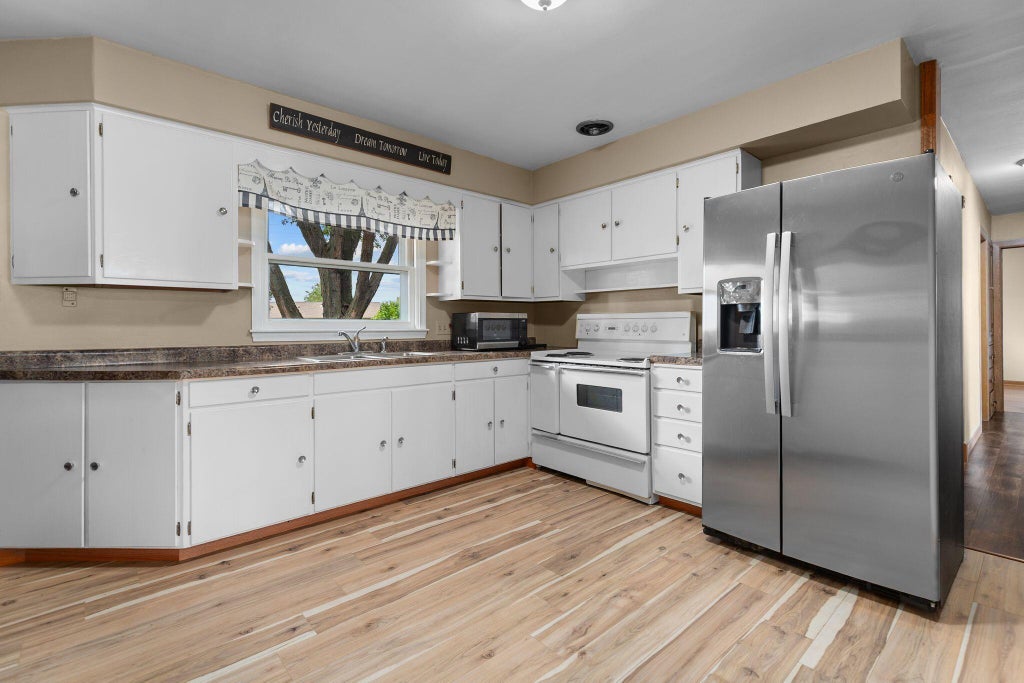 Enjoy view of Lake Winnebago from this ranch home with a ''Country Feel''. This home sits on a spacious lot with mature trees. Home has open Living Room and Semi-formal Dining area. Low maintenance aluminum siding and stone exterior. Newer furnace. Central Air. Full egress for LL which features semi finished rec rm, half bath and room for 4th bedroom. Direct access to Peebles Trail on back side of property. Short walk to Lakeside Park and Marina.