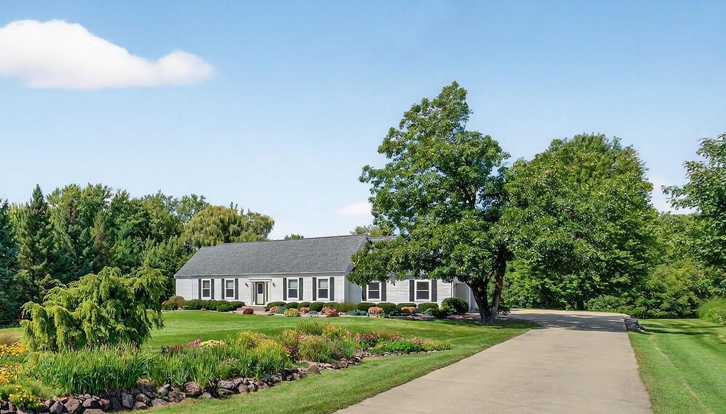 Beautifully maintained 4-bed, 3-bath open-concept ranch on 1.6 acres with a private pond. Main floor features hardwood floors, fireplace, large windows, and seamless flow from kitchen to living areas. Finished walkout basement includes guest suite, extra living space, and access to backyard. Enjoy peaceful views from the large deck. Includes 3-car garage, main-level laundry, luxurious primary suite, new roof (2024), and bonus 800 sq ft storage/workout room under garage. Low taxes and great location!
