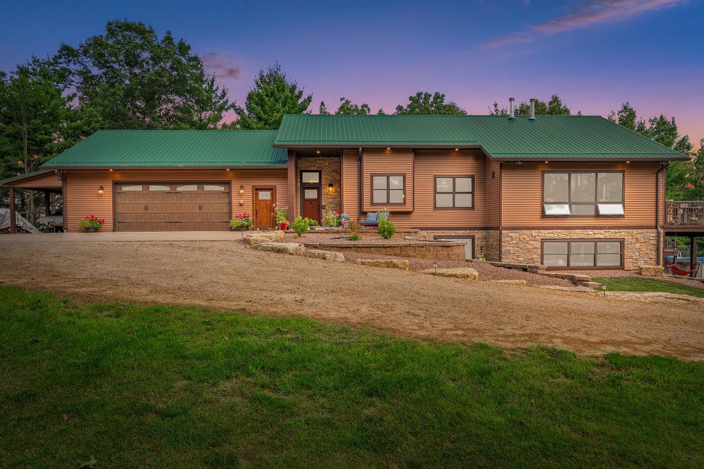 An unparalleled, serene, executive residence tucked on nearly ten wooded acres overlooking peaceful terrain. This 4 bed, 3 bath property features a quiet setting with pristine landscaping. The heated 2.5-car garage connects to a welcoming foyer near the mudroom and main floor laundry. The kitchen boasts granite countertops, hickory cabinets, and stainless steel appliances. Seamlessly transitioning into the living room, enclosed by large fiberglass windows, a custom wood-burning fireplace creates a cozy and inviting ambiance. The master suite showcases a cedar-lined ceiling, walk-in closets, and a private bathroom hosting a whirlpool tub. Downstairs includes a family room, wet bar, three bedrooms, and an exercise room. The east-facing deck and walk-out patio cap off an unmatched homestead!
